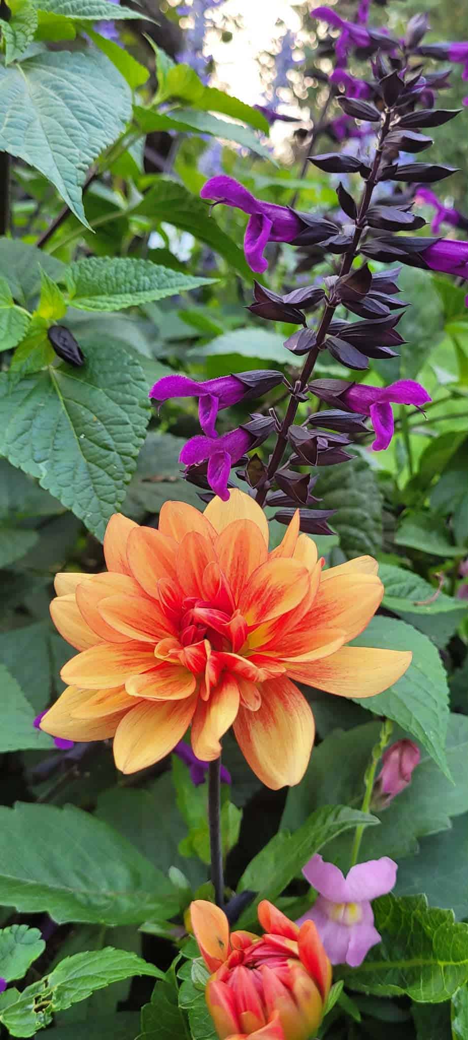 This is a very short dahlia so great for containers. I don’t know the name so have always just called it “Short Orange Dark Stem”.